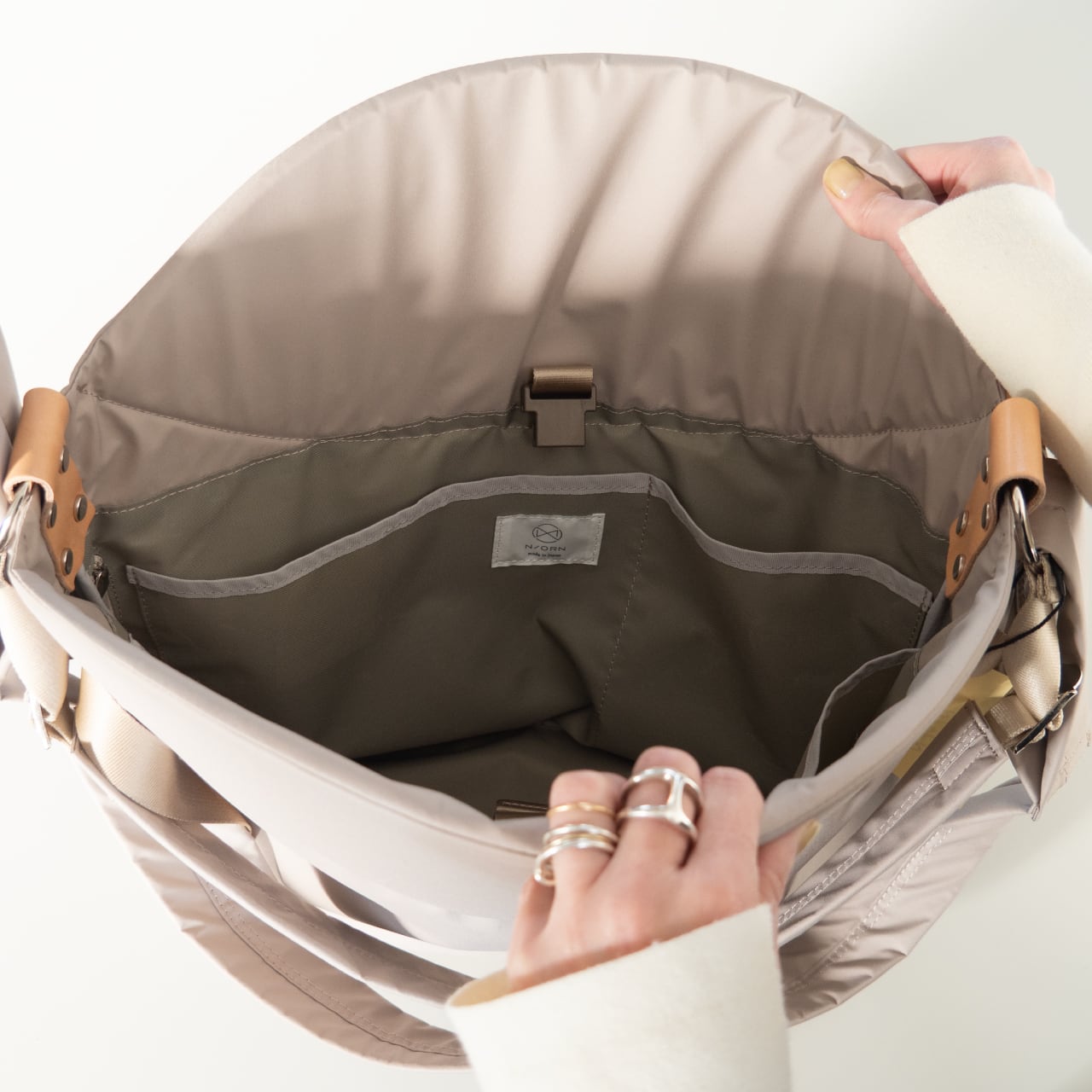 光沢のない落ち着いた質感の国産の高機能生地と、ポイントにヌメ革を使用。サイドのアイアンリングなどのパーツは重厚感のあるシルバーで統一しています。
